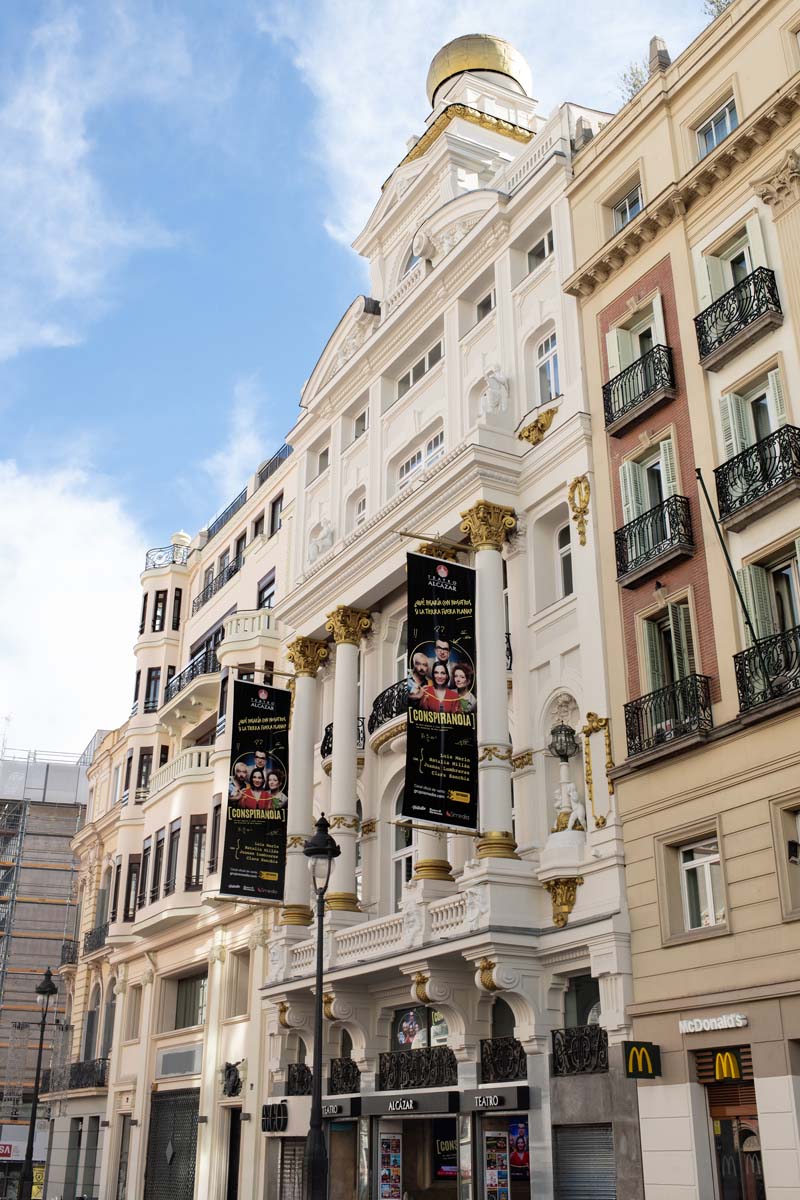 Ubicado en la céntrica calle de Alcalá, el Teatro Alcázar es uno de los espacios escénicos con más historia de Madrid. Inaugurado en 1925 sobre el solar del antiguo Trianón Palace, su elegante edificio de estilo clásico fue obra de los arquitectos Eduardo Sánchez Eznarriaga y Eduardo Lozano Lardet. A lo largo de casi un siglo, ha acogido revistas, comedias, musicales y espectáculos de gran éxito, consolidándose como un referente del teatro madrileño. Tras varias rehabilitaciones que han preservado su encanto original, el Alcázar continúa ofreciendo una variada programación contemporánea en pleno corazón de la capital.
